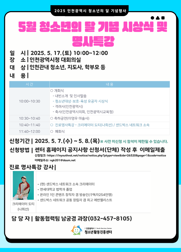 [인천광역시청소년활동진흥센터] 2025 청소년의 달 기념 시상식 및 명사특강 신청 안내