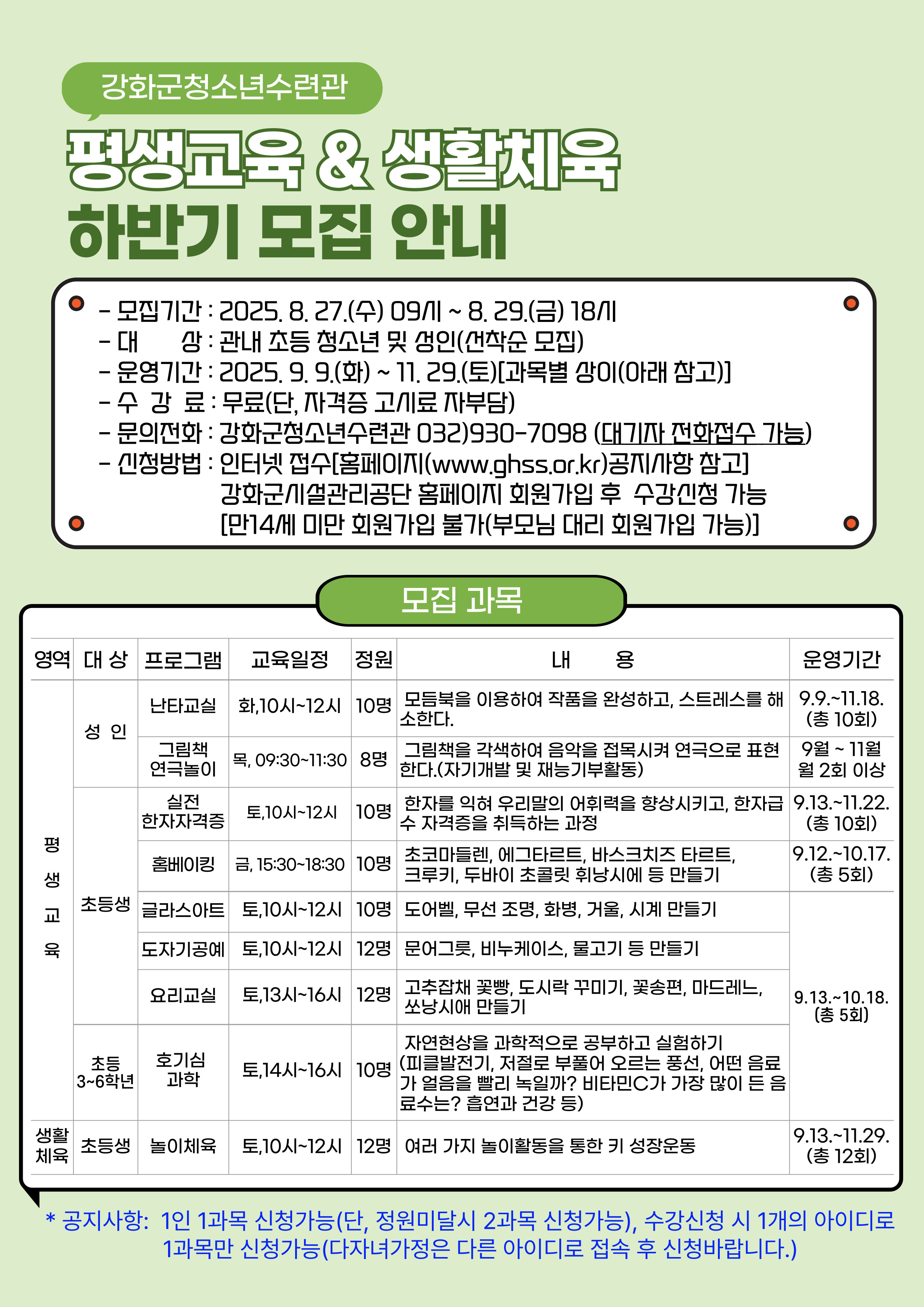[강화군청소년수련관]2025년 하반기 평생교육 및 생활체육 프로그램 참가 신청자 모집