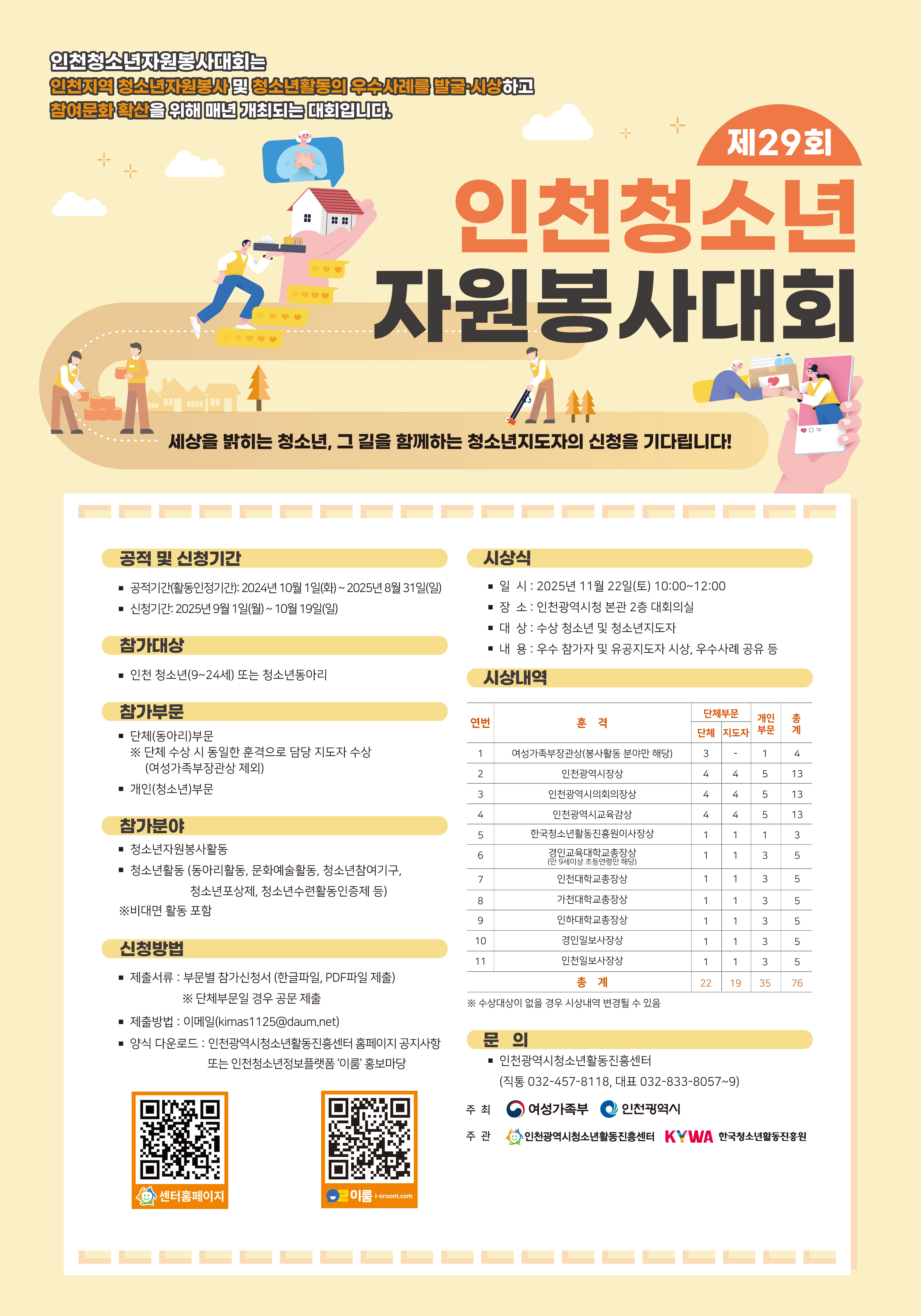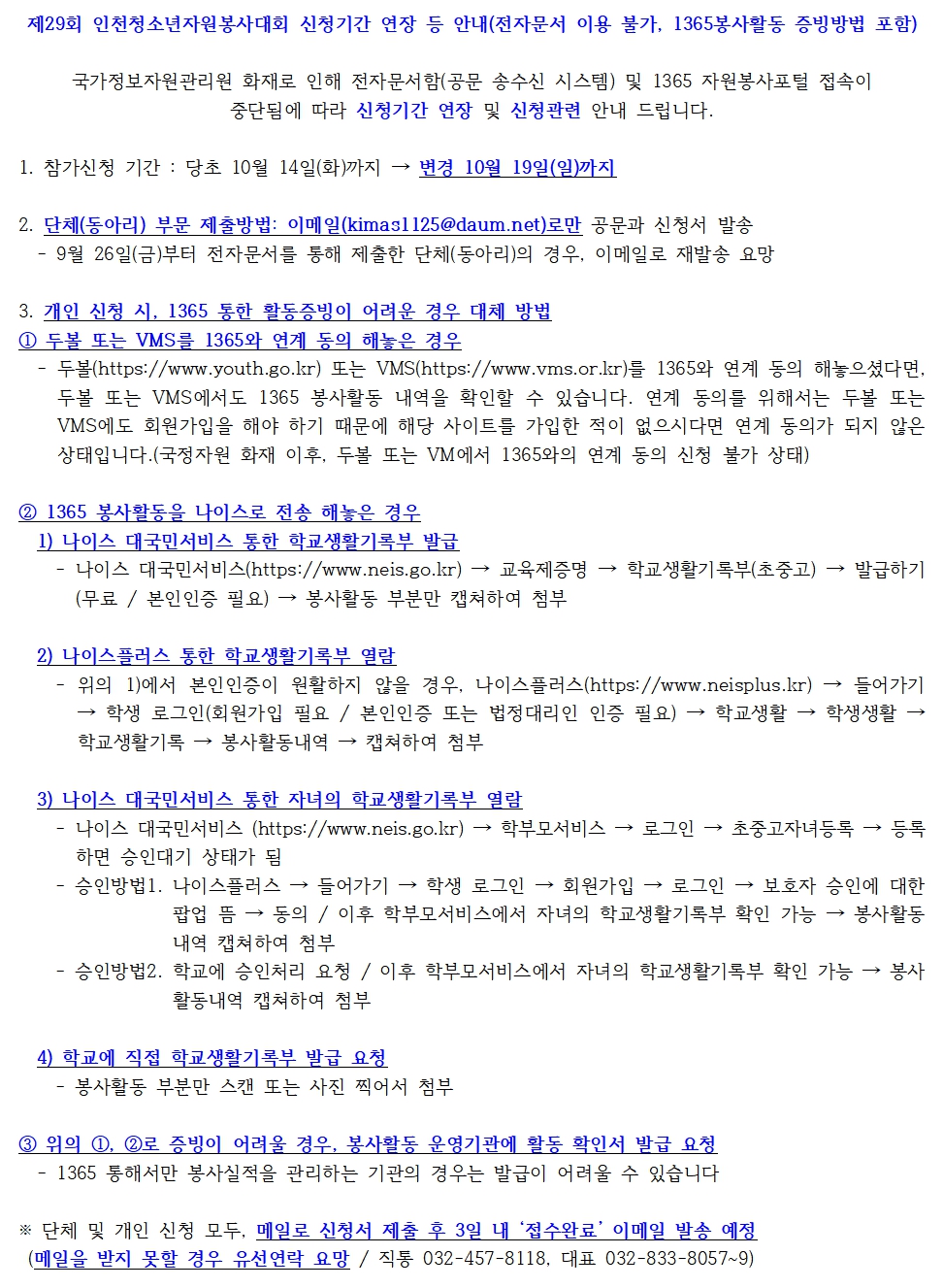 제29회 인천청소년자원봉사대회 신청기간 연장 등 안내(전자문서 이용 불가, 1365봉사활동 증빙방법 포함)
