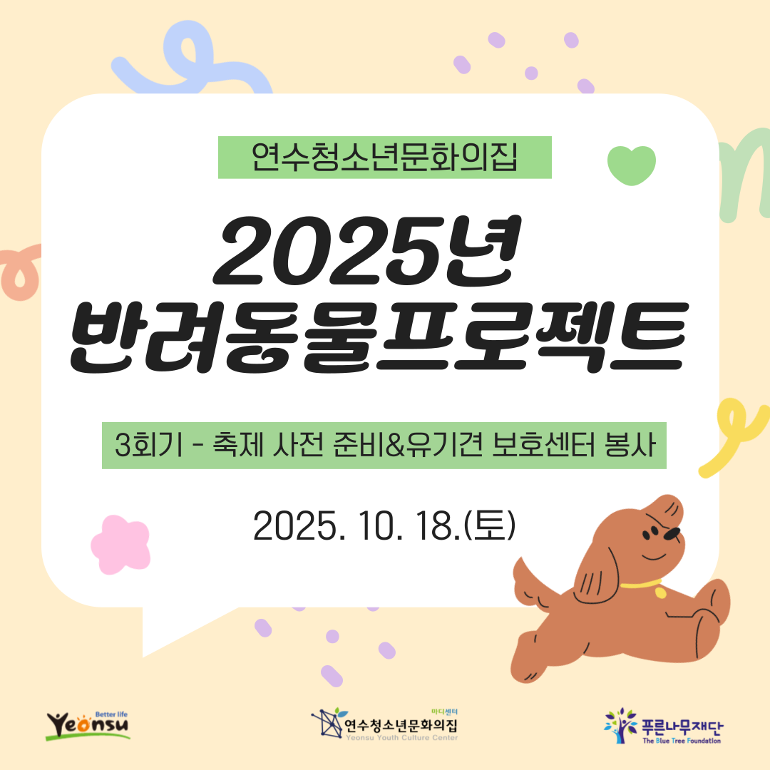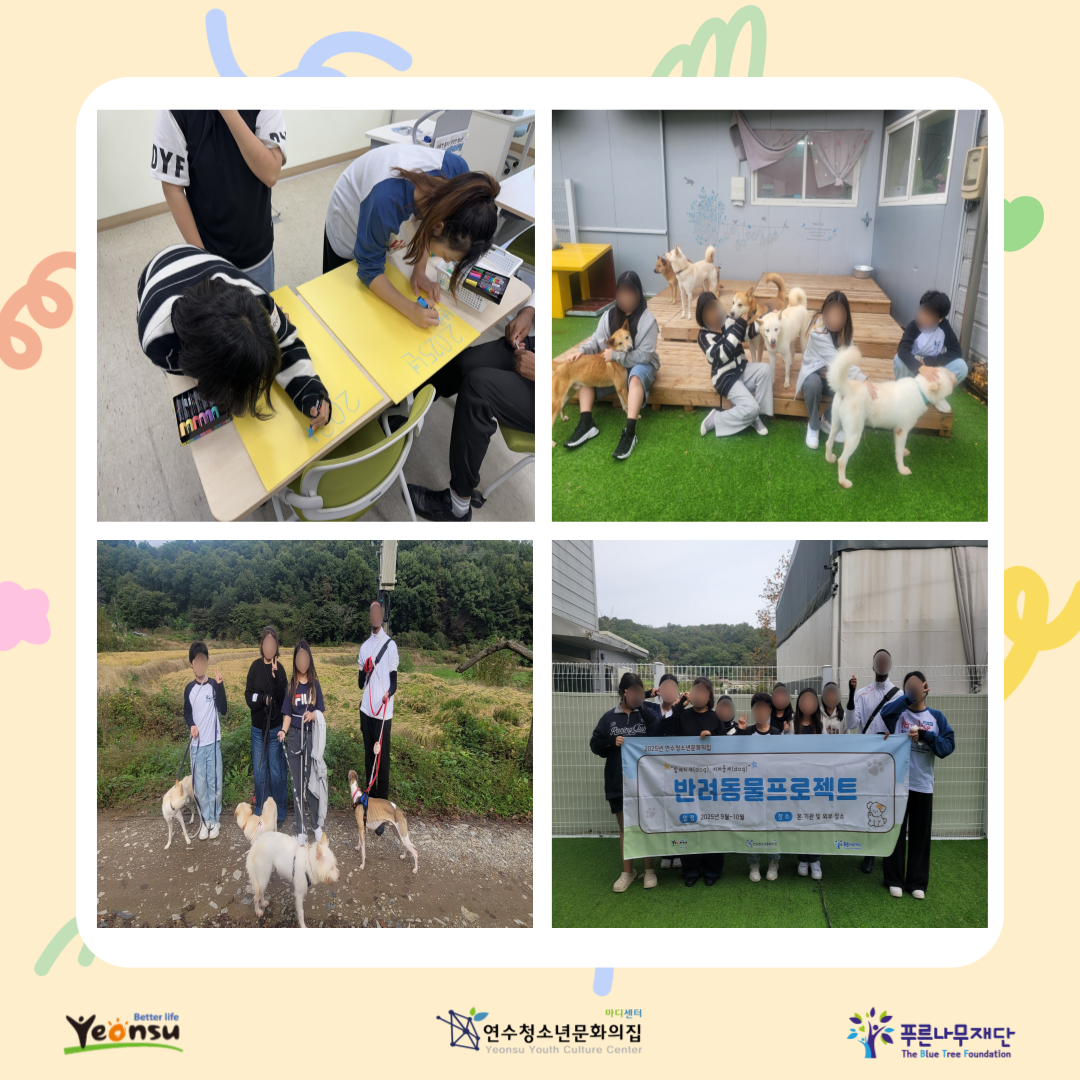 안녕하세요, 연수청소년문화의집입니다!저번주 토요일에는 「반려동물프로젝트」 3회기가 진행되었습니다 🐾다음 주 열리는 청소년 축제 ‘꿈틀축제’에서 지난 활동을 홍보하기 위해 사전 준비를 진행했으며,점심식사 후에는 유기견 보호센터에서 산책 봉사와 센터 봉사활동을 진행했습니다.마지막 회기인 다음 주 활동에도 많은 관심과 기대 부탁드립니다!💛