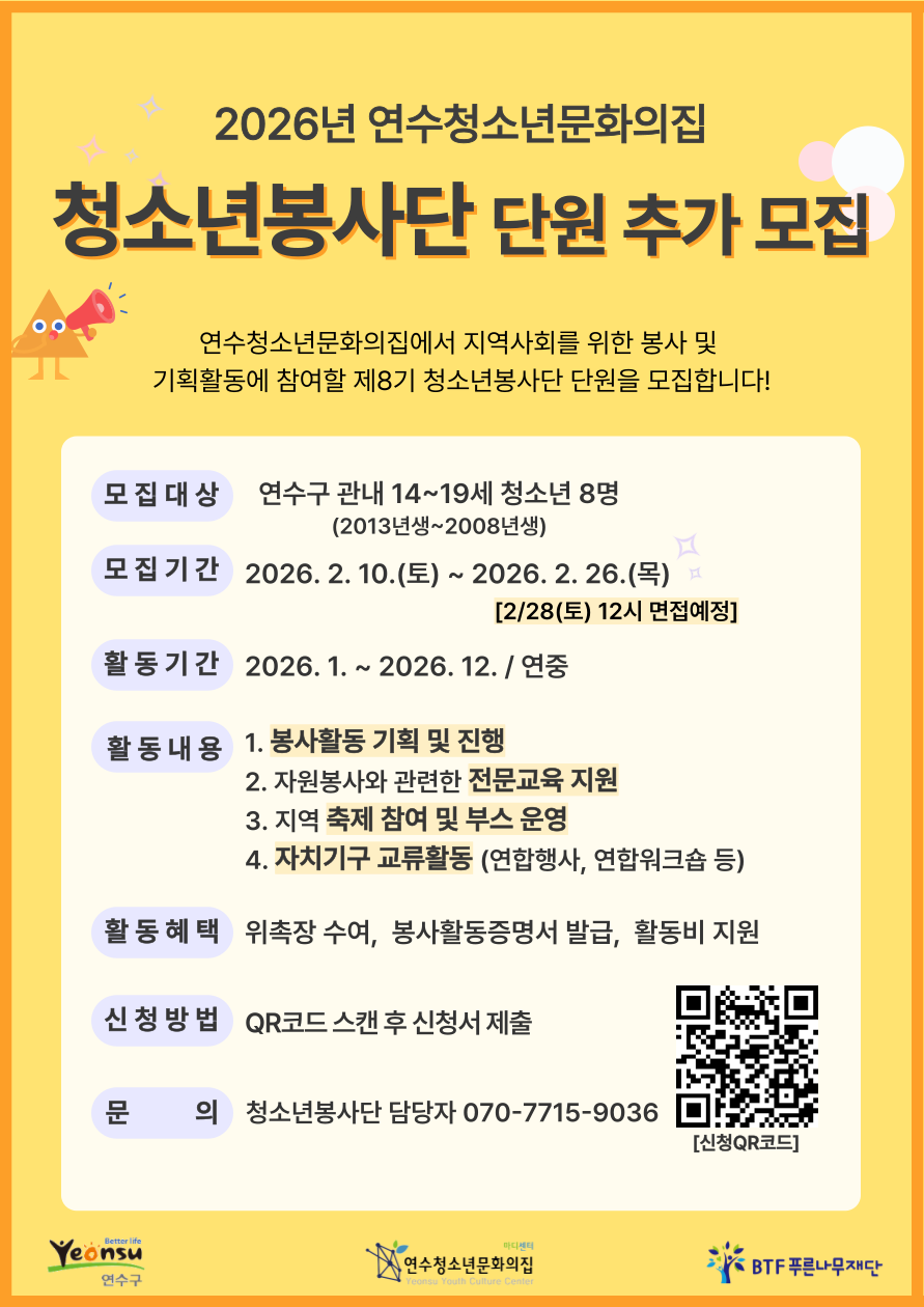 [연수청소년문화의집] 2026년 제8기 청소년봉사단 단원 추가 모집