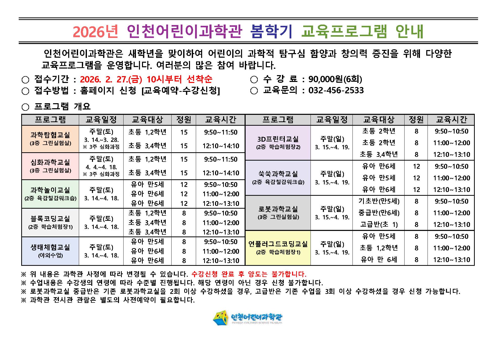 [인천어린이과학관] 2026년 봄학기 교육프로그램 안내