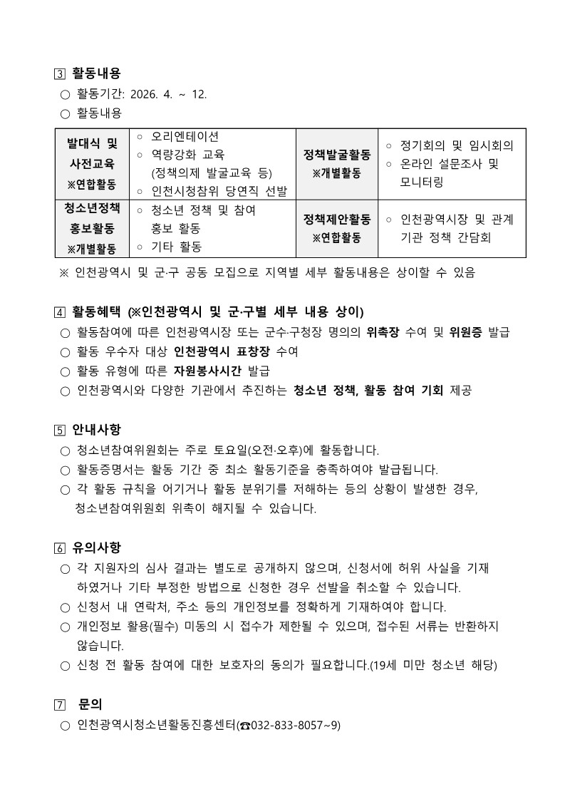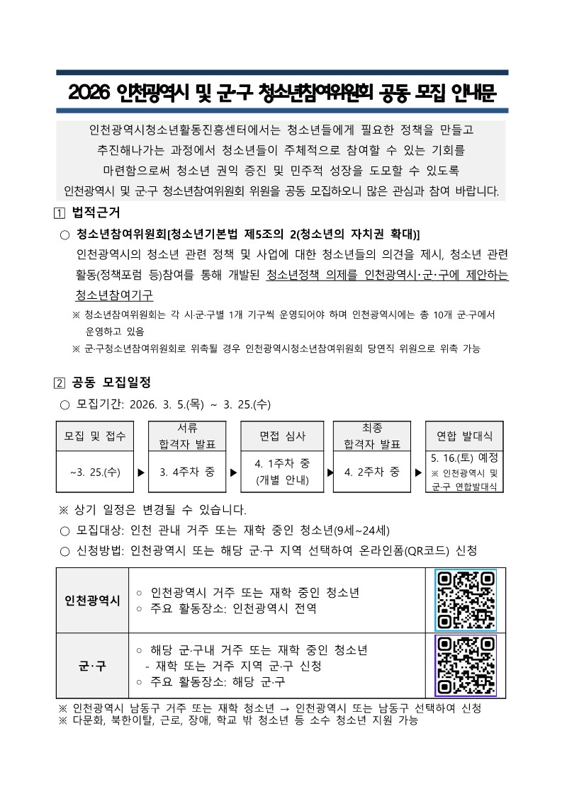 [인천광역시청소년활동진흥센터] 2026 인천광역시 및 군·구 청소년참여위원회 모집