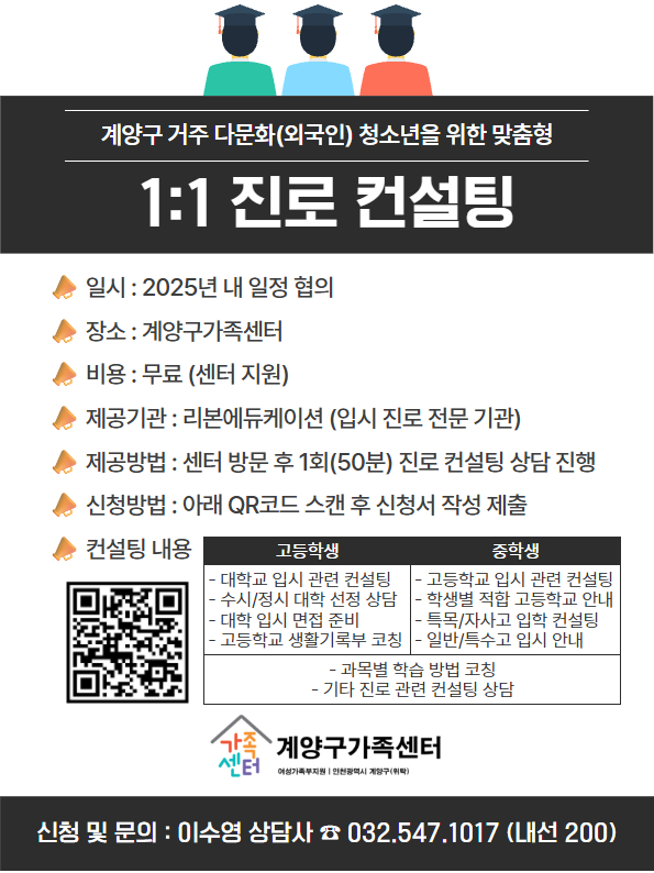 계양구 거주 다문화 중·고등학생의 진로성장을 위해 전문기관과 연계하여 1:1 진로컨설팅을 지원합니다.