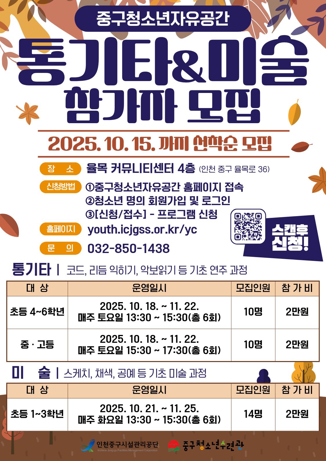 [중구청소년자유공간] 10~11월 통기타&미술 프로그램 참여 청소년 모집
