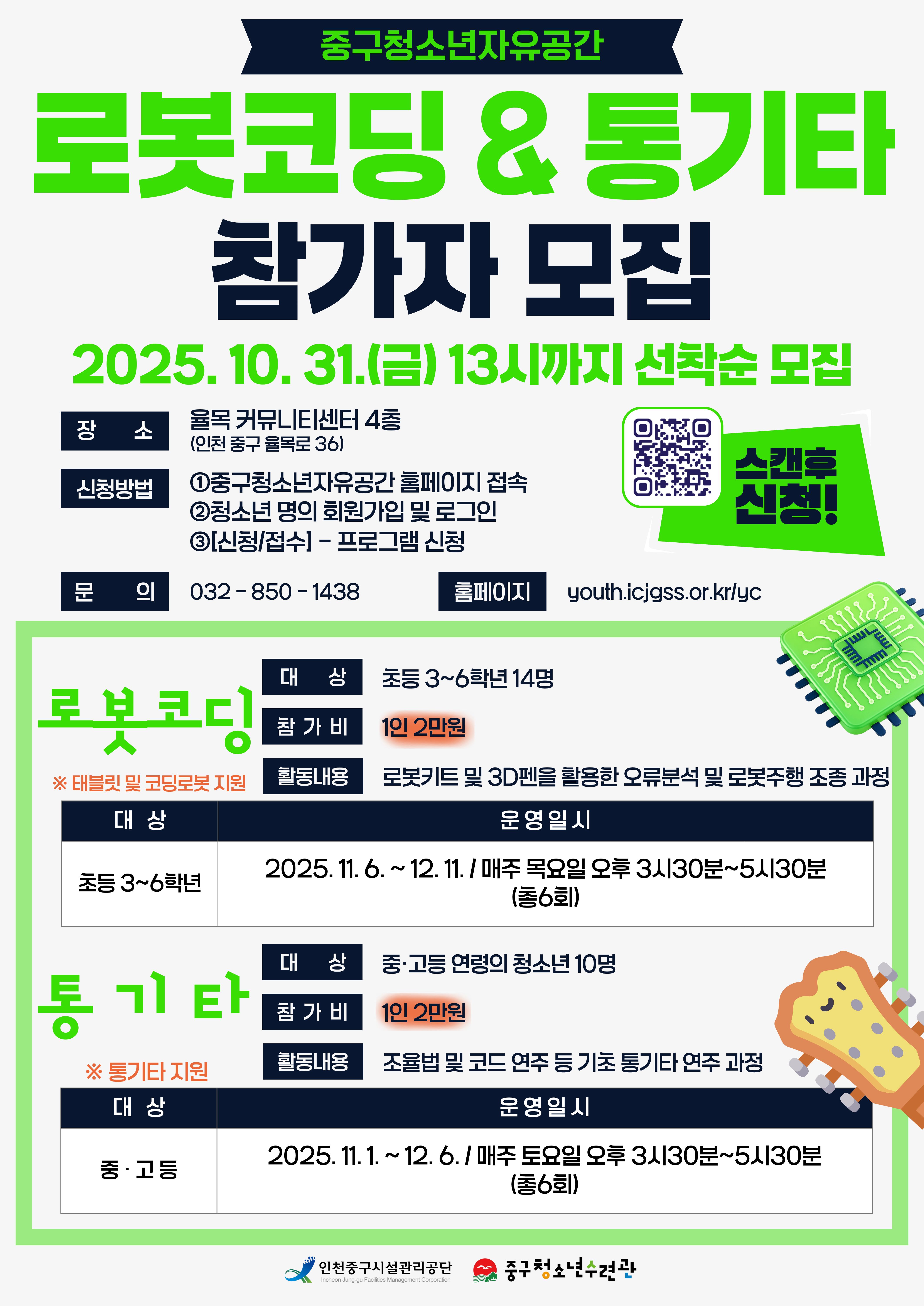 [중구청소년자유공간] 11~12월 로봇코딩&통기타 프로그램 참여 청소년 모집