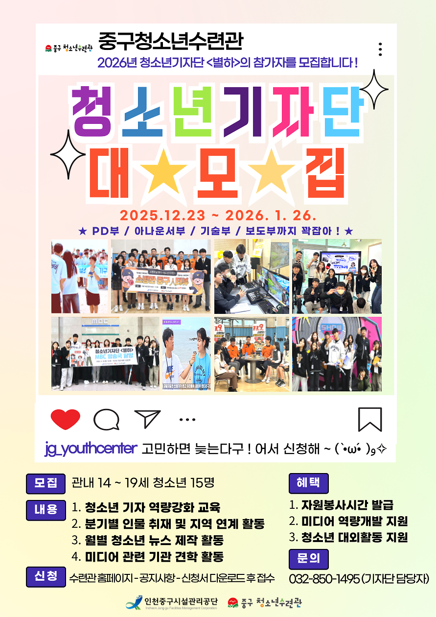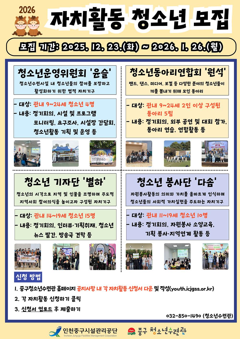 신청방법 : 중구청소년수련관 홈페이지 > 공지사항 > 2026청소년동아리연합회 신규 모집 > 신청서 다운로드 >