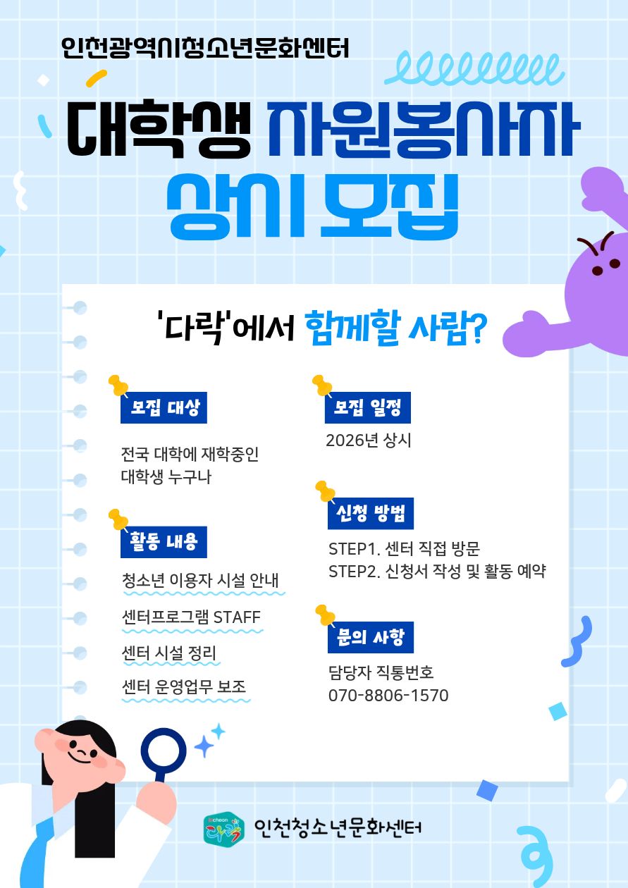 인천청소년문화센터에서 초~고등 청소년들을 위해 자원봉사를 해줄