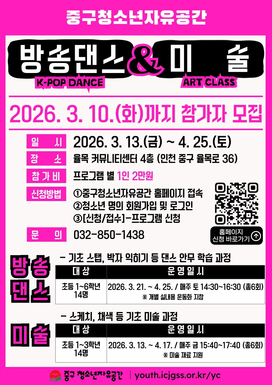 [중구청소년자유공간] 3월 방송댄스&미술 프로그램 참여 청소년 모집