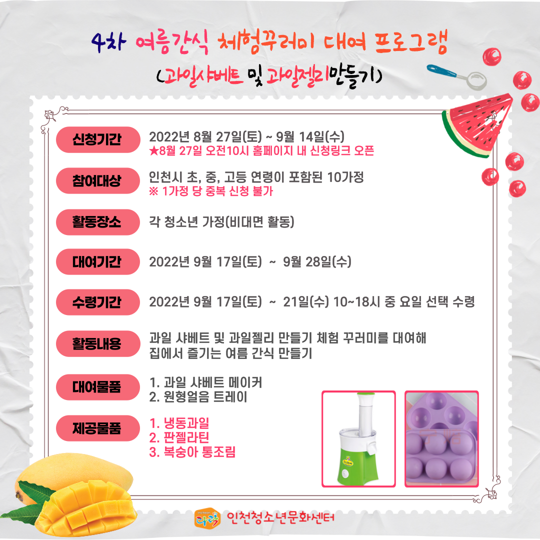 여름간식 체험꾸러미 대여 프로그램 (과일 샤베트 및 과일 젤리 만들기) 참가자 모집