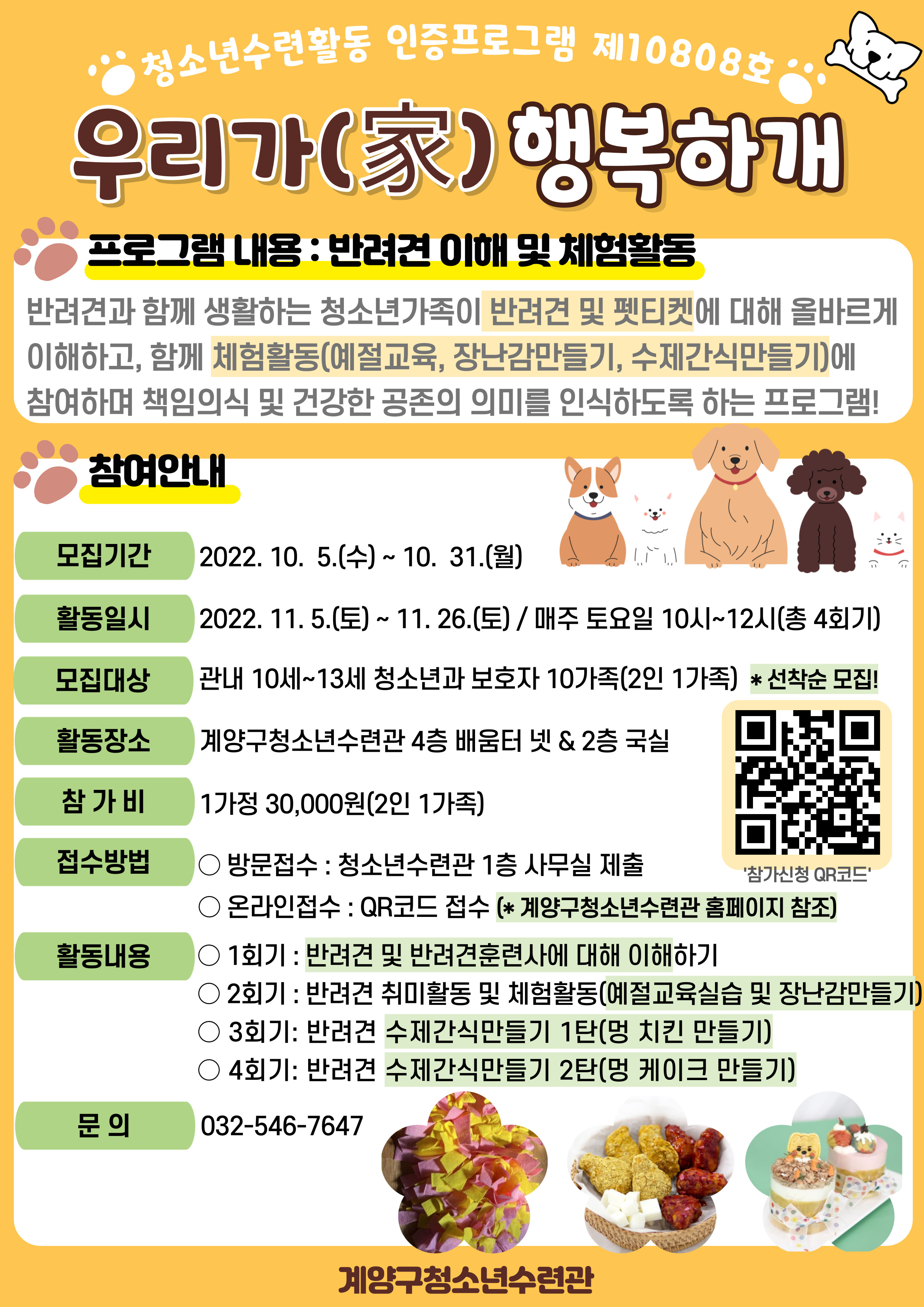 청소년수련활동 인증프로그램 제10808호 『우리가(家) 행복하개』 참가자를 모집합니다!