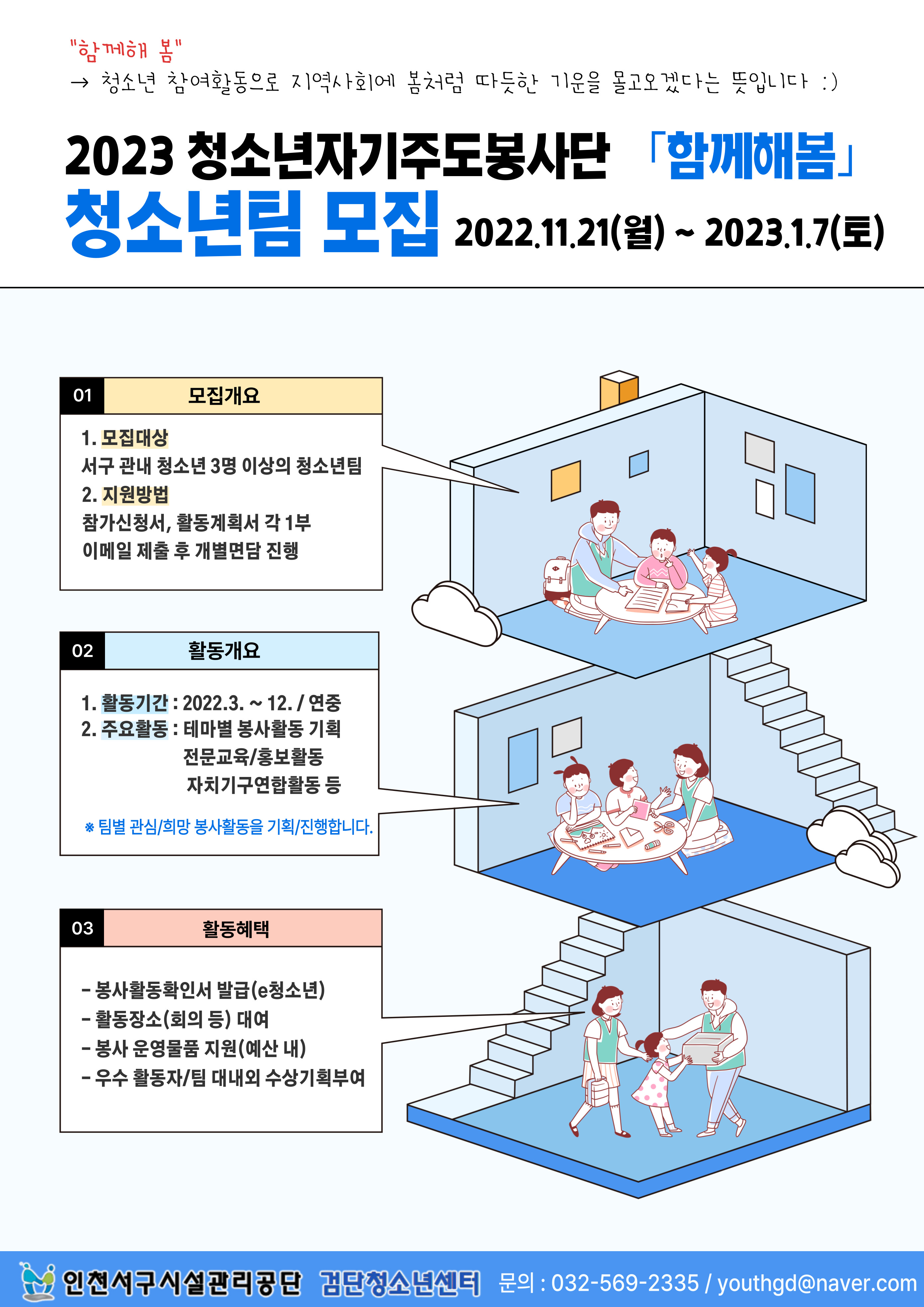 검단청소년센터와 2023년도에 함께할 「2023. 청소년자기주도봉사단 함께해봄」 청소년팀을 모집합니다^^