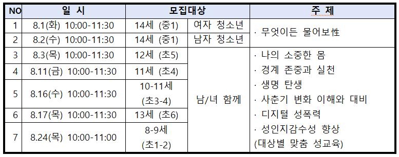 성교육 시간표를 참고하시어, 많은 신청과 문의 바랍니다.