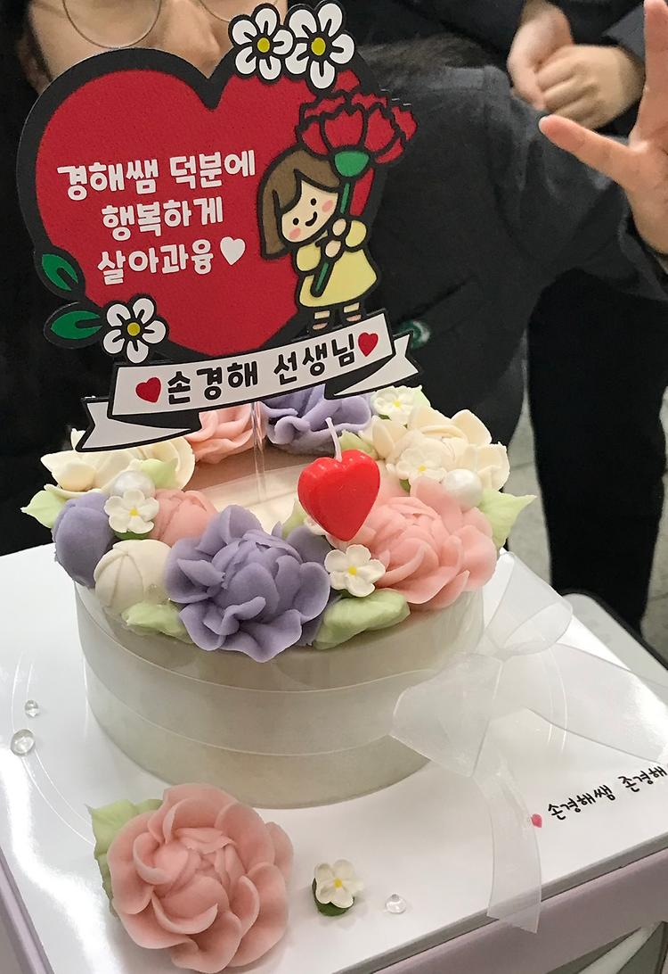 이 케이크는 '경해쌤 덕분에 행복하게 살아과융'이라는 토퍼를 뽑으면 저희 반 친구들이