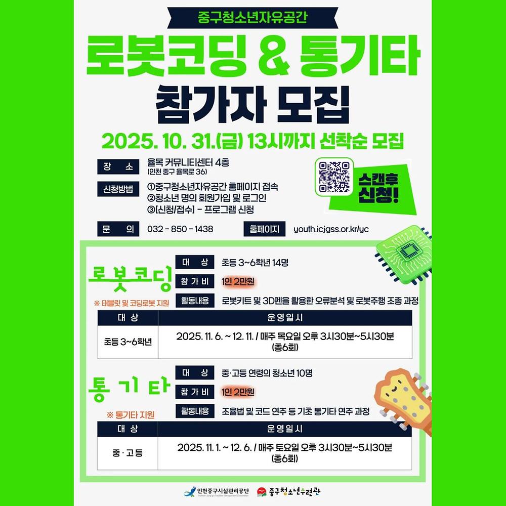 [중구청소년자유공간] 11~12월 로봇코딩&통기타 프로그램 참여 청소년 모집